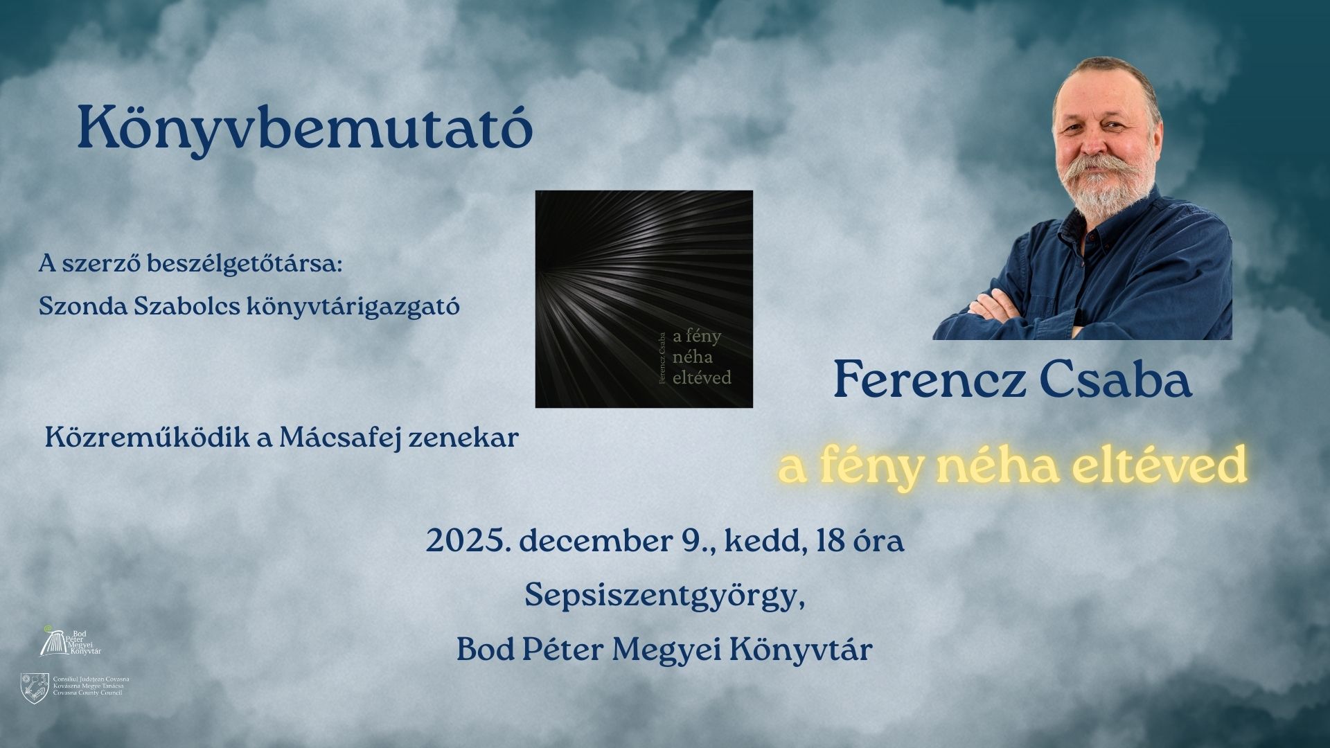2025. december 2., kedd2025. december 9-én, kedden 18 órától könyvtárunk Gábor Áron termében lesz Ferencz Csaba a fény néha eltéved című versalbumának bemutatója.