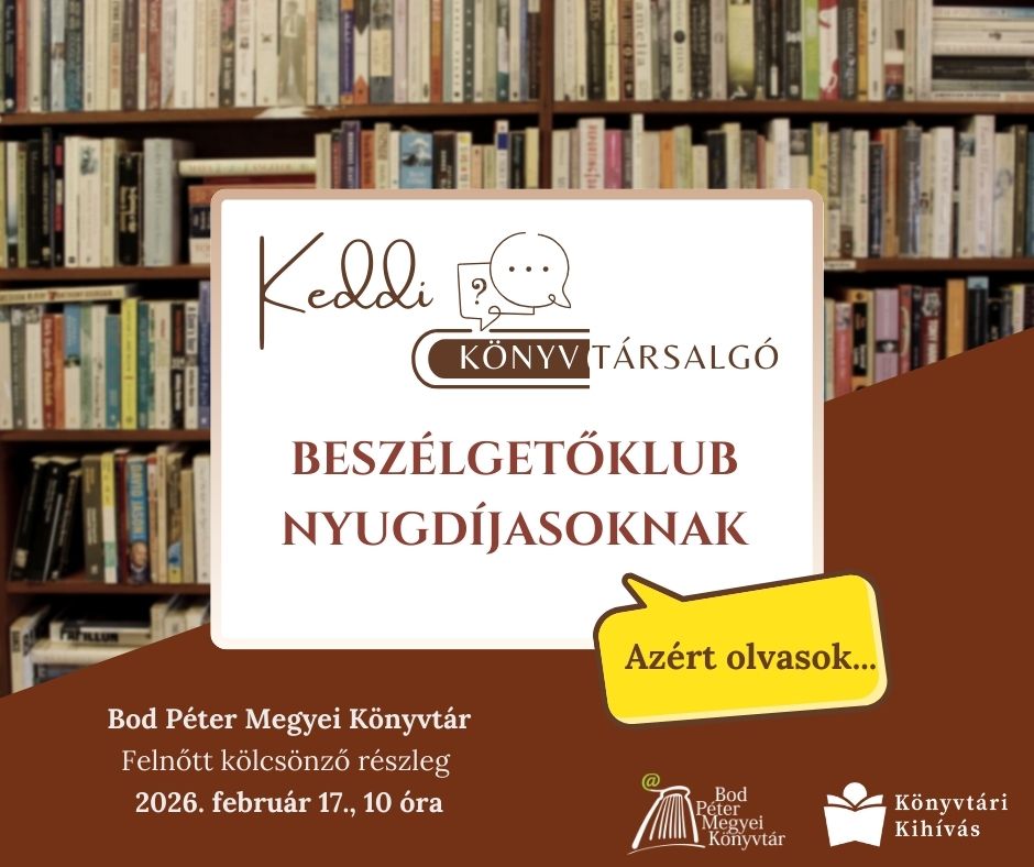 2026. február 12., csütörtökKeddi Könyvtársalgó beszélgetőklubunk 2026. február 17-én ismét szeretettel vár!