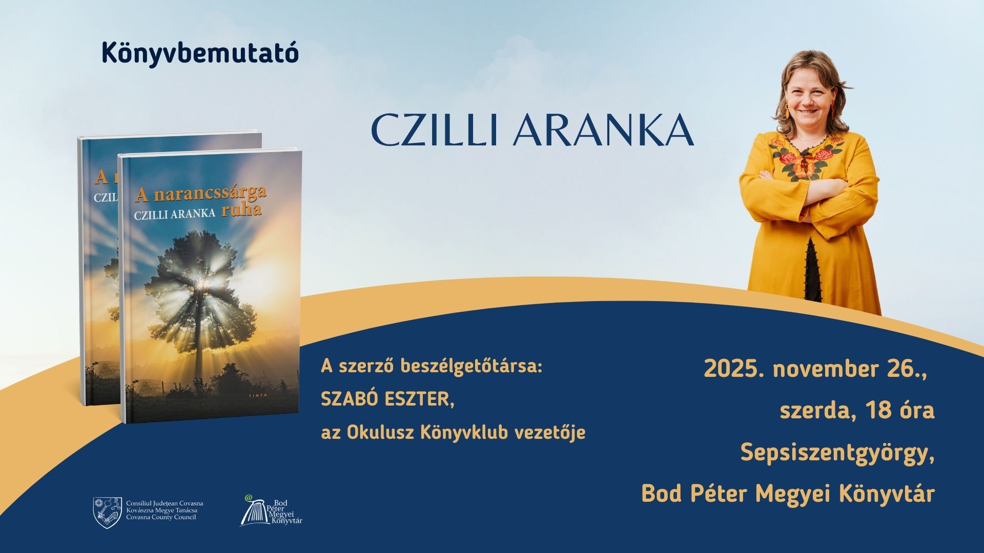 Miercuri, 26 noiembrie 2025, de la ora 18:00, în biblioteca noastră va avea loc lansarea noului volum intitulat A narancssárga ruha al poetei și scriitoarei Czilli Aranka.