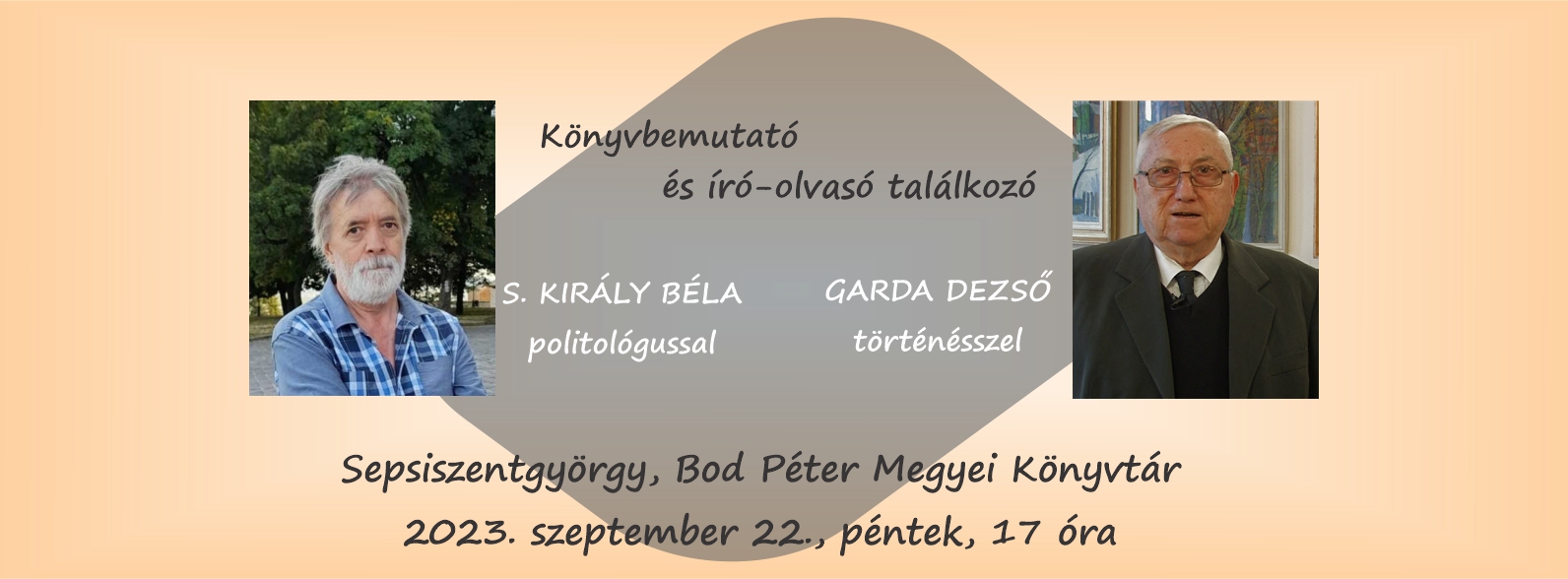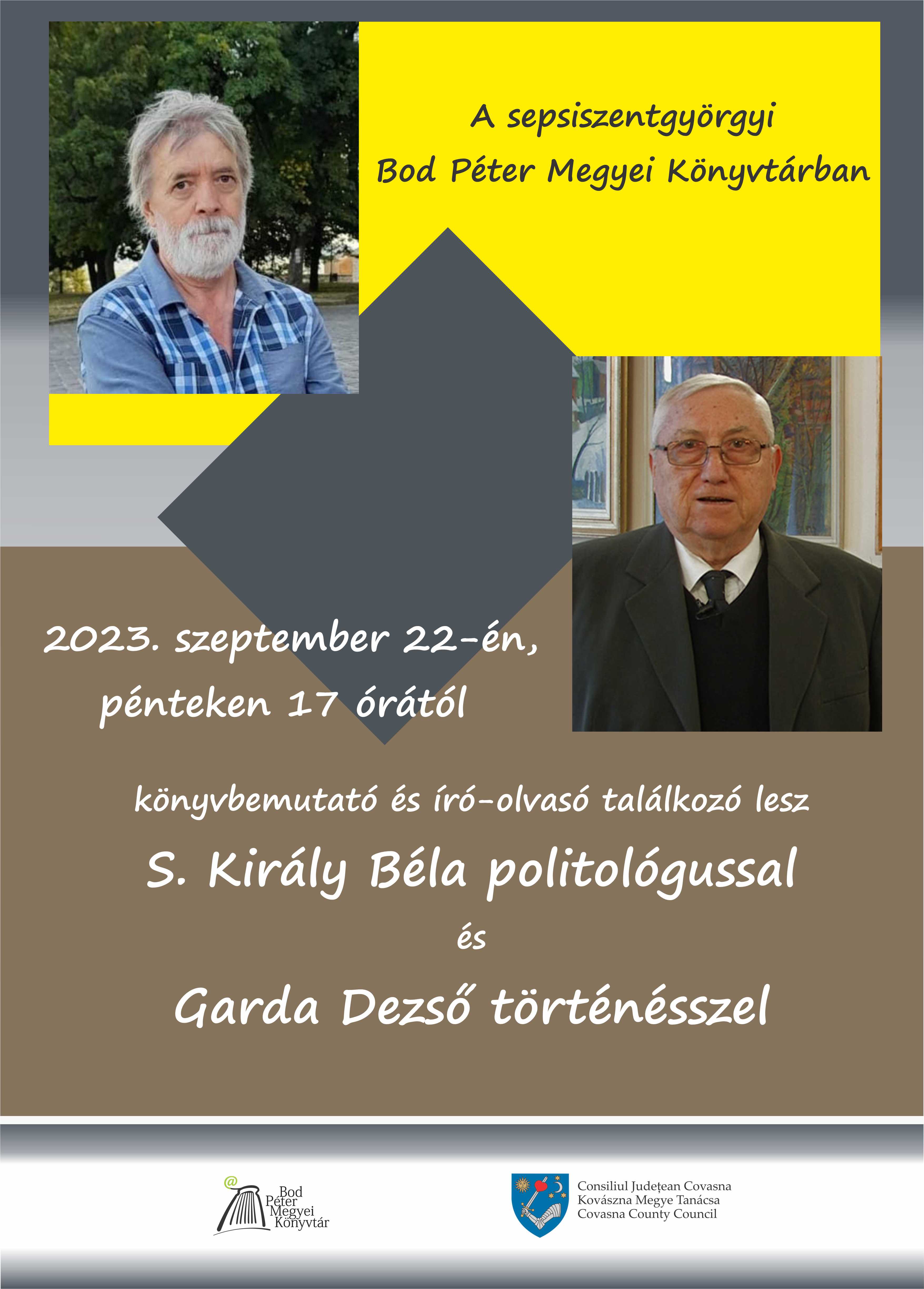 Vineri, 22 septembrie 2023Vineri, 22 septembrie 2023, de la ora 17, la biblioteca noastră va avea loc o prezentare de carte și o întâlnire cu autori, avându-i ca invitați pe politologul S. KIRÁLY BÉLA și istoricul GARDA DEZSŐ. Discuția dintre autori va oferi o imagine de ansamblu despre volumul de eseuri și interviuri Sárgamellényben (esszék, interjúk) semnat de S. Király Béla, precum și despre volumul documentaristic A közbirtokosság és magyar nyelvű főiskolák. Képviselői tevékenységem a romániai magyar sajtóban (1997–2000) al lui Garda Dezső.
