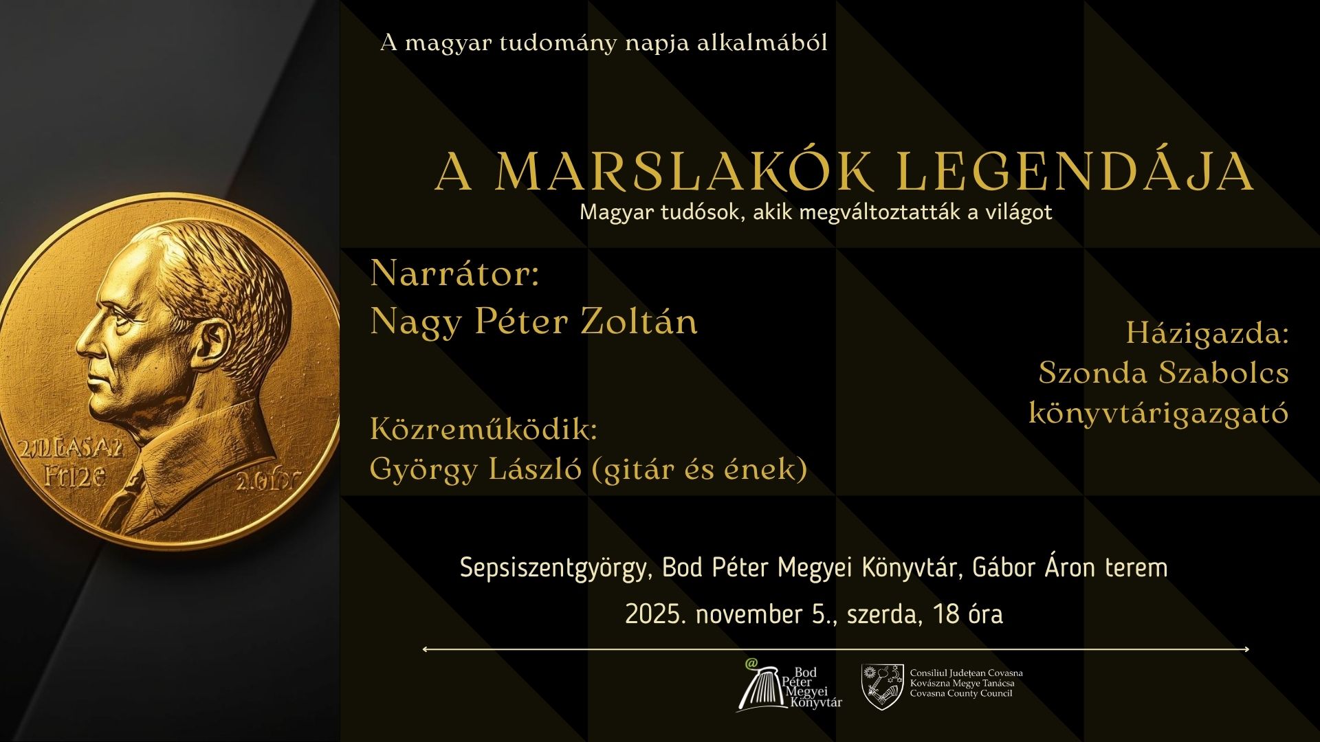 Joi, 30 octombrie 2025Cu ocazia Zilei Științei Maghiare, pe 5 noiembrie 2025, miercuri, de la ora 18:00, în sala Gábor Áron a bibliotecii noastre va avea loc o prezentare educativă cu muzică, dedicată savanților maghiari laureați ai Premiului Nobel, recomandată atât elevilor, cât și adulților.
